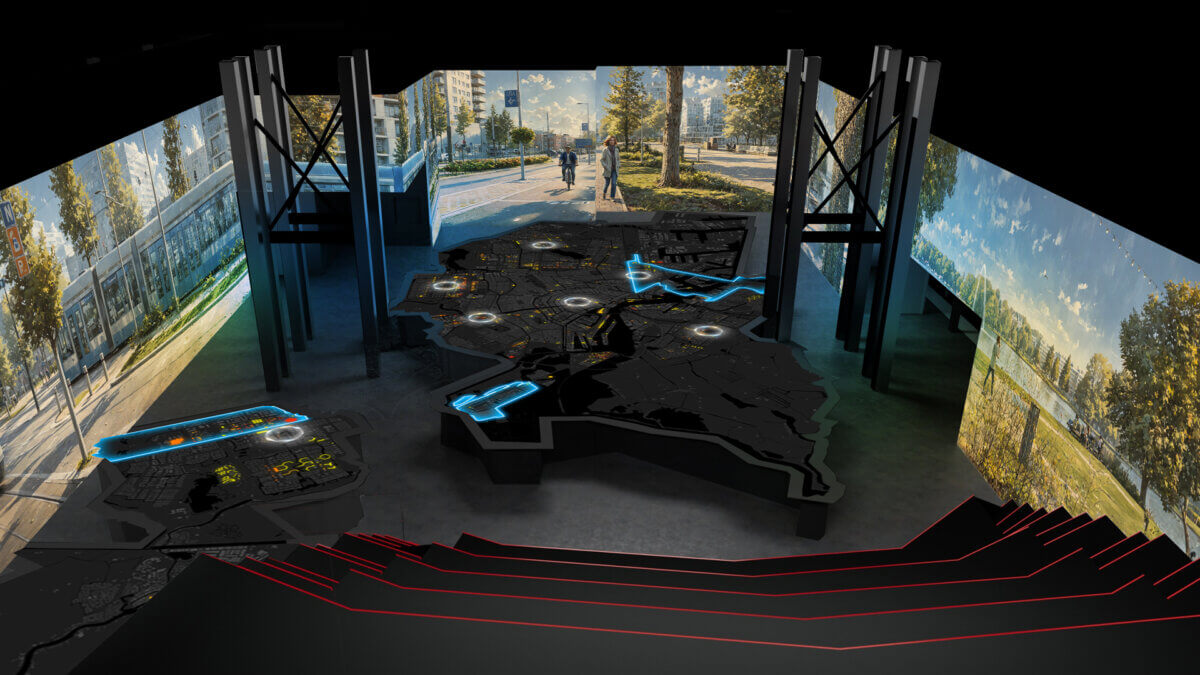 Een verdieping hoger nodigt een interactieve tentoonstelling bezoekers uit om mee te denken over grootstedelijke uitdagingen. Thema’s zijn onder meer wonen, mode, Ajax, migratie, klimaat en biodiversiteit.
