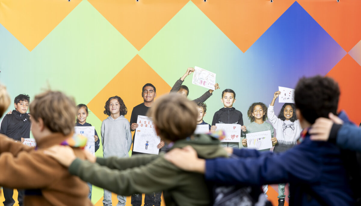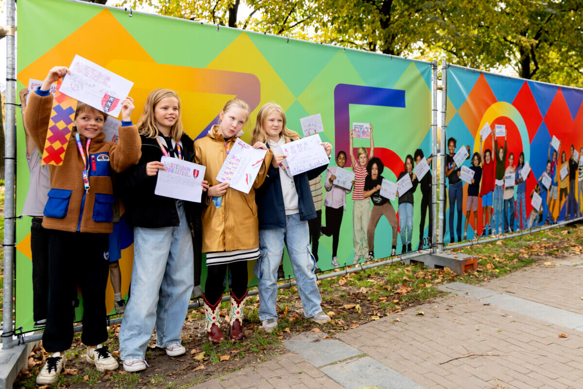 Vandaag opende stadsdeelbestuurder Flora Breemer (Amsterdam-Zuid) officieel de tentoonstelling Amsterdam voor Altijd…. Waarbij de wensen van vijfhonderd leerlingen uit heel de stad verzameld. Foto’s van de leerlingen en hun wensen worden in de expositie aan elkaar verbonden in een 350 meter lange menselijke slinger op het Museumplein. Zo vormen alle scholen en stadsdelen één geheel in de expositie van het Amsterdam van de toekomst.