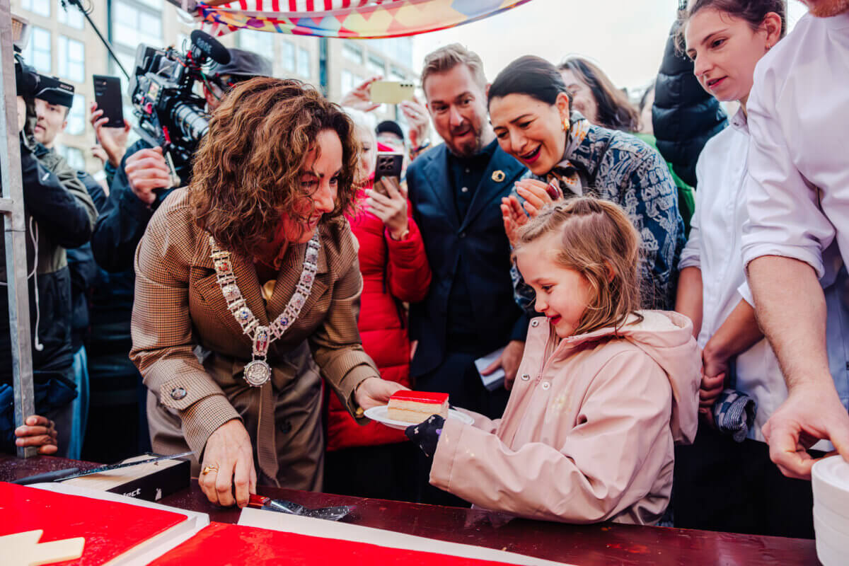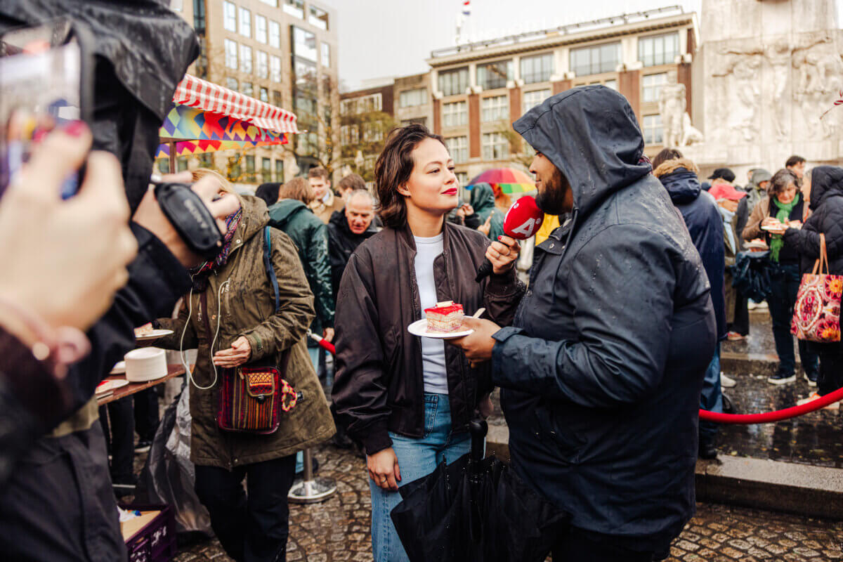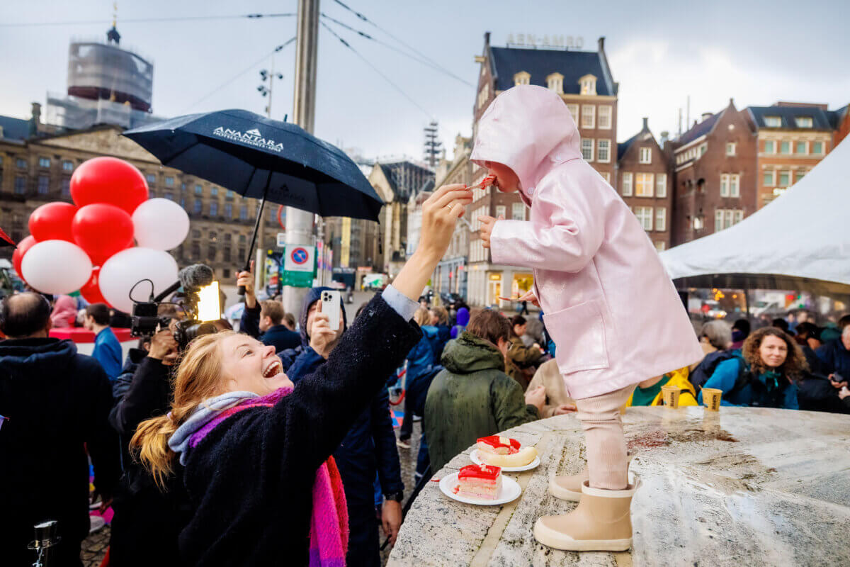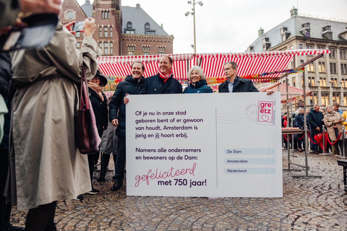 Met het aansnijden van een 75 meter lange taart om 7.50 uur op de Dam is het startschot gegeven van de 750-ste verjaardag van onze stad. Het eerste stuk taart werden aangesneden door Burgemeester Halsema en uitgedeeld aan voorbijgangers en buurtbewoners. De Bijenkorf, Grand Hotel Krasnapolski en de Biz Dam (ondernemers en pandeigenaren) hebben deze mooie actie georganiseerd. Een cadeau aan de stad.