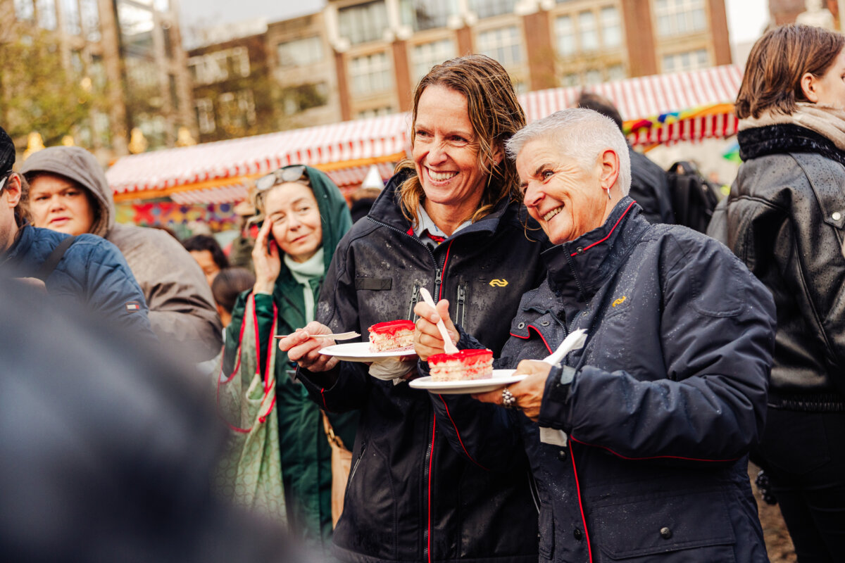 Een deel van de taart op de Dam is ook uitgedeeld op diverse plekken in de stad. Het college van burgemeester en wethouders stapten vanaf de Dam in feestelijk versierde busjes met opdruk ‘Het laatste Rondje’, dat doelt op de laatste actie in dit jubileumjaar. Burgemeester Halsema trakteert later vandaag de vrijwilligers van De Regenbooggroep en medewerkers van het Leger des Heils op taart. Wethouder Scholtes gaat naar het personeel van het Emma Kinderziekenhuis en zal hen trakteren op 400 taartjes. Wethouder Moorman zal het personeel van basisschool De Knotwilg en het Leerorkest in stadsdeel Zuidoost bezoeken. Verder zullen er op winkelpleinen en markten door de hele stad in totaal zo’n 10.000 taartjes worden uitgedeeld aan buurtbewoners en voorbijgangers.
