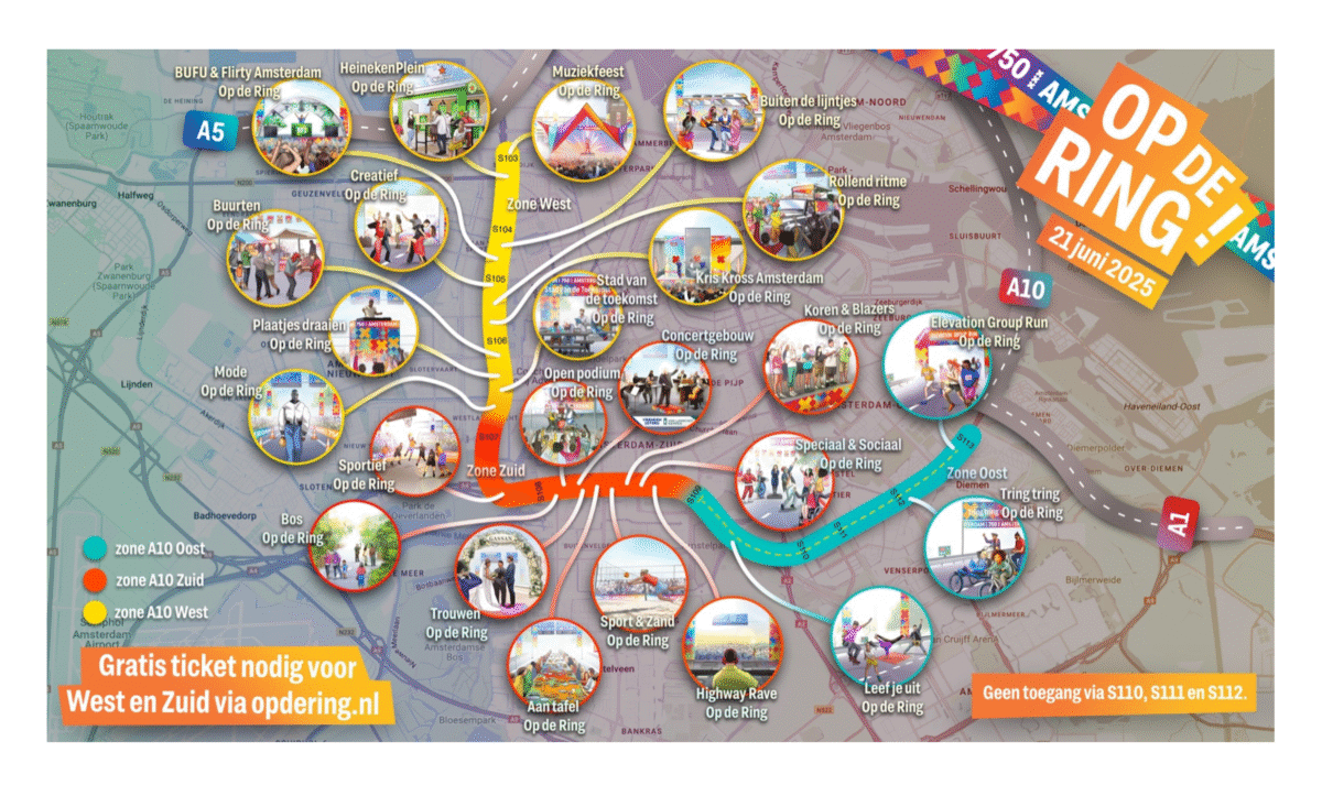 Op het programma in zone A10 West en A10 Zuid staan zo’n 25 onderdelen ontwikkeld door meer dan 200 Amsterdamse initiatiefnemers. Naast Trouwen Op de Ring, waarbij 20 Amsterdamse stellen elkaar het jawoord geven, en een echt Bos Op de Ring met maar liefst 750 grote en 7500 kleine bomen, is er nog veel meer te beleven. Zo vindt er eenmalig het Muziekfeest Op de Ring plaats, met optredens van onder anderen Jan Smit en Danny de Munk. Ook is er Creatief Op de Ring, waar Amsterdamse musea de handen ineenslaan met creatieve verenigingen. Op het podium Highway Rave Op de Ring zorgt Audio Obscura voor ritmische beats op de snelweg. Kijk voor het hele programma en de plattegrond op www.opdering.nl.