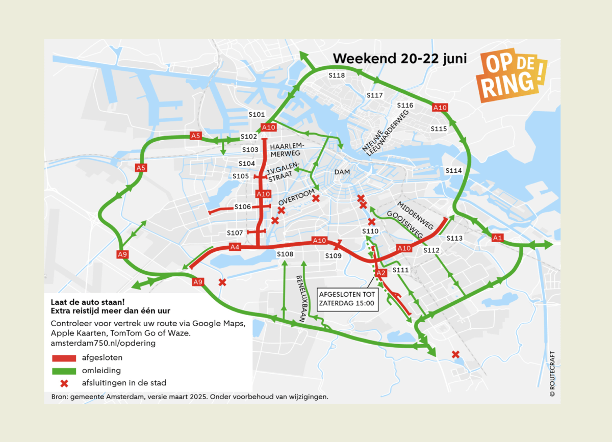 Op vrijdagavond 20 juni 2025 wordt de Ring West, Zuid en Oost (tussen de afslag naar de A5 en de afslag naar de A1) vanaf 21:00 uur afgesloten. Op zaterdag 21 juni is de binnenring overdag en in de avond dé plek voor feestvierende bezoekers. De buitenring blijft open voor de nood-en hulpdiensten en openbaar vervoer. Op zondag bouwen we af en maken we schoon. Daarna wordt de gehele Ring A10 vanaf 15:00 uur weer opengesteld voor verkeer. Het regionaal verkeer wordt omgeleid via de A1/A9/A5. Houd rekening met extra reistijd die kan oplopen tot meer dan één uur.