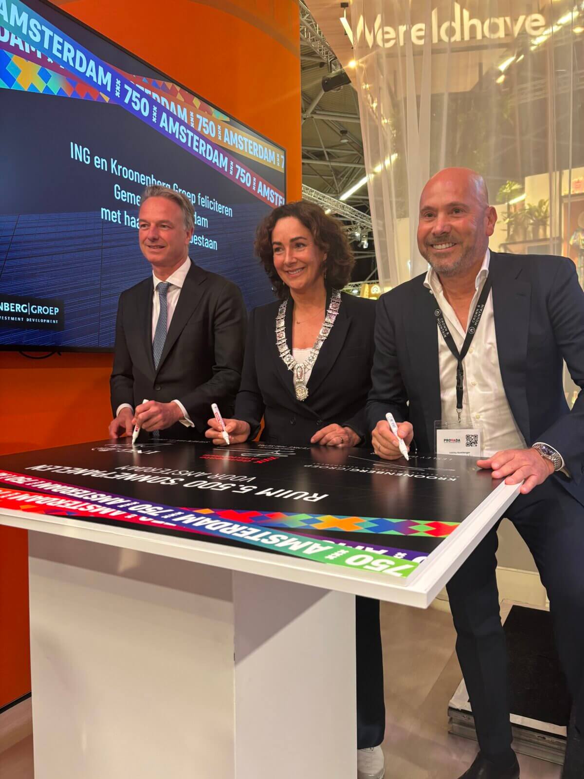 Mayor Halsema received the gift today from the CEOs of ING and Kroonenberg Groep. This took place at Provada, the annual real estate fair at the RAI. Mayor Halsema: ''This gift to the city is a wonderful example of social commitment from the Amsterdam business community. It benefits Amsterdammers and social organizations that need lower energy bills the most. It fits within the initiatives of the New Amsterdam Alliance, where companies, residents, and the government contribute to the city's livability. Not a one-time gesture, but a real investment in the future. For that, I want to thank ING and Kroonenberg Groep.''