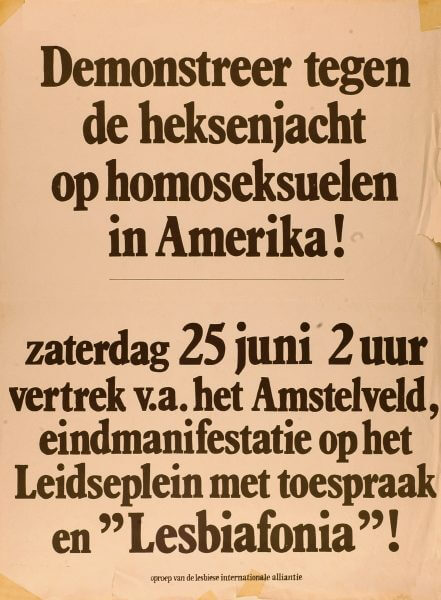 Hier bleef het niet bij. Het COC stuurde Carter een protesttelegram en koos het politieke pad. Een groep actieve Nederlandse lesbiennes wilde hun verontwaardiging luid laten horen. Op dinsdag 14 juni kreeg de Internationale Lesbische Alliantie toestemming van de Amsterdamse politie om een mars te houden tijdens het weekend waarin elders ter wereld de Gay Pride-marsen plaatsvonden (Christopher Street Day). Voor deze ‘Internationale homobevrijdings- en solidariteitsdag’ organiseerden zij met succes in korte tijd een kleine mars van zo’n 2000 deelnemers. Deze demonstratie op 25 juni 1977 ging door dwars door Amsterdam en eindigde op het Leidseplein, voor Hotel American.