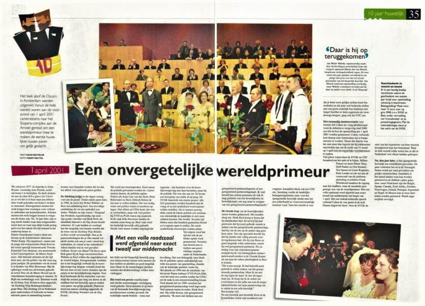 Na dertien jaar lobbyen was het eindelijk zover: op 1 april 2001 om middernacht gaven vier stellen elkaar het jawoord. De openstelling van het burgerlijk huwelijk was een feit. De huwelijken werden gesloten door toenmalig burgemeester van Amsterdam Job Cohen in de Amsterdamse Stopera: