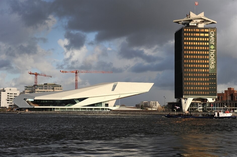 Het Eye Film Instituut Nederland op Overhoeks, IJpromenade 1, gezien vanaf het IJ. Rechts Toren Overhoeks. De A’DAM toren uit 1966 als kantoor en laboratorium van Shell. Sinds 2016 is het herontwikkeld tot een combinatie van kantoren, uitgaansgelegenheden en een observatiepunt met een ronddraaiend restaurant. Het nieuwe aangezicht van de IJ-kant van Noord benadrukt de verandering van Noord van een industriegebied naar een moderne woonwijk.