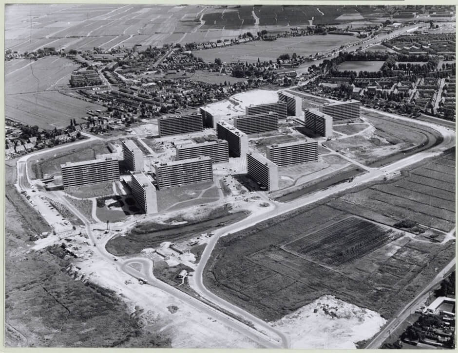 1968. Luchtfoto naar zuidoosten, met Molenwijk in aanbouw. Molenwijk is ontworpen door architect Klaas Geerts, en bestaat voor 100 procent uit hoogbouw. Van bovenaf gezien lijken de gebouwen op de wieken van een molen. Vandaar de naam ‘Molenwijk’.