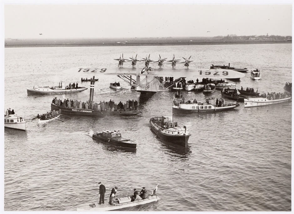 1930. Luchthaven Schellingwoude. De Dornier DO X. Een 6-motorig watervliegtuig. Naast Schiphol werd in 1916 ook de vliegbasis Schellingwoude in gebruik genomen voor watervliegtuigen van de marine. Deze locatie op Zeeburg met de benaming Marine Vliegkamp was operationeel tot de jaren 50. Soms landden er ook burgervliegtuigen zoals de vliegboot Dornier Do X, die op zijn reis naar Amerika in 1930 ook Amsterdam aandeed. In de beginjaren van de luchtvaart was het nog onduidelijk of land- of watervliegtuigen de toekomst hadden. Pas eind jaren 30 werd duidelijk dat de vliegtuigen die gebruikmaakten van vliegvelden het meest betrouwbaar waren. Voorzieningen voor watervliegtuigen werden toen opgeheven.