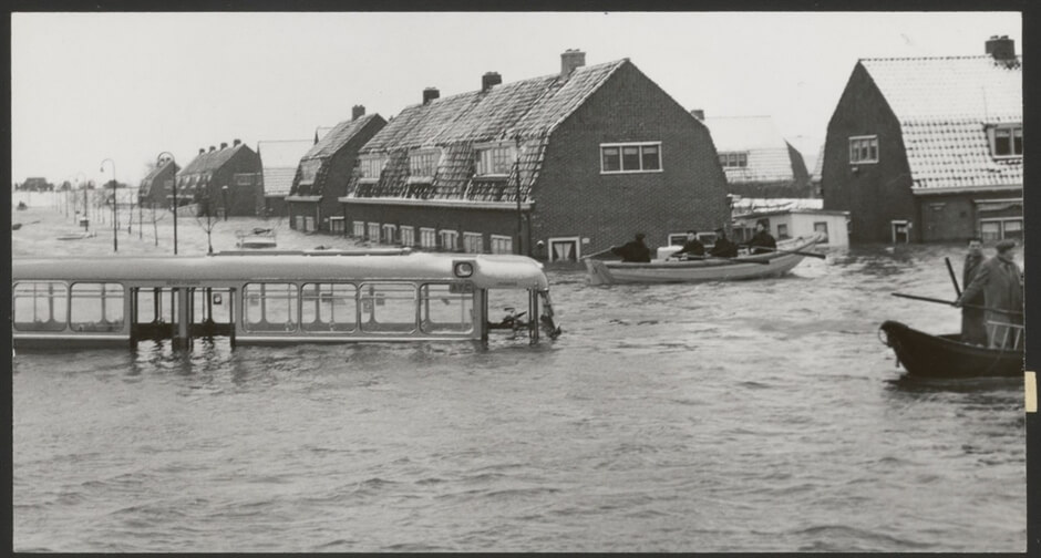 1960. Kometensingel 265-315. De overstroming van Tuindorp Oostzaan verraste ook een stadsbus die over de Meteorenweg reed. Op 14 januari 1960 brak de dijk bij het Noordzeekanaal. Tuindorp Oostzaan overstroomde. Nadat de dijk op 16 januari was gedicht, begon men met het wegzuigen van de enorme watermassa. Op 29 januari konden de bewoners terugkeren naar hun huizen. Toen ze binnenkwamen, was de schrik groot. Veel meubilair was onherstelbaar beschadigd en kon meteen naar buiten gedragen worden.