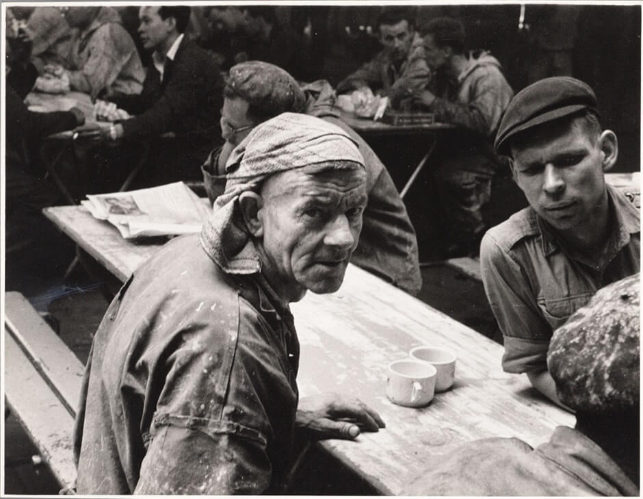 1957. Stuwadoors van de KNSM (De Koninklijke Nederlandse Stoomboot Maatschappij) aan de Levantkade tijdens de schaft. Stuwadoors zijn laders en lossers van schepen. In 1981 sloot het bedrijf zich aan bij Nedlloyd, dat nu gefuseerd is met een Brits bedrijf.