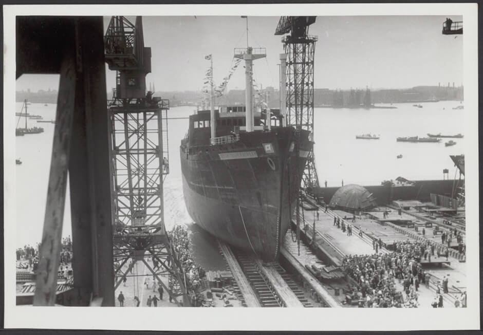1950. Het te water laten van een schip op de helling van de Nederlandsche Dok- en Scheepvaart Maatschappij (NDSM). De werf ging in 1984 failliet. Dat was een symbolisch moment voor het verdwijnen van de industrie in Amsterdam. In plaats van op van arbeiders en fabrieken ging de economie vooral draaien op de dienstverlening. In het verleden was de NDSM een van de grootste en modernste scheepswerven ter wereld. Op de NDSM-werf staan nog veel gebouwen en voorwerpen uit deze tijd. Al jaren trekt de werf creatieve ondernemers en vele bezoekers uit binnen- en buitenland. De NDSM-werf is in Noord en de rest van Amsterdam een begrip. Nu vooral door de dancefeesten en voorstellingen die er worden gehouden, maar ook door het rauwe karakter en de lege ruimte van het gebied.