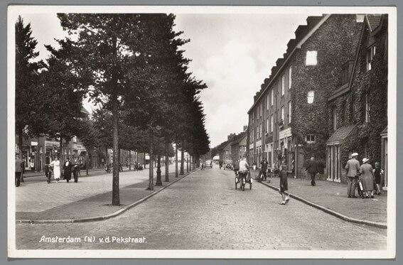 1939. Van der Pekstraat. Woonbuurt in de Buiksloterham tussen het Mosplein en het Van der Pekplein, gebouwd tussen 1917 en 1926. Vrijwel alle woningen zijn ontworpen door architect Van der Pek, die in 1919 overleed. De centrale straat en het zuidelijke plein werden toen naar hem vernoemd. Later werd zijn naam gebruikt voor de hele buurt.