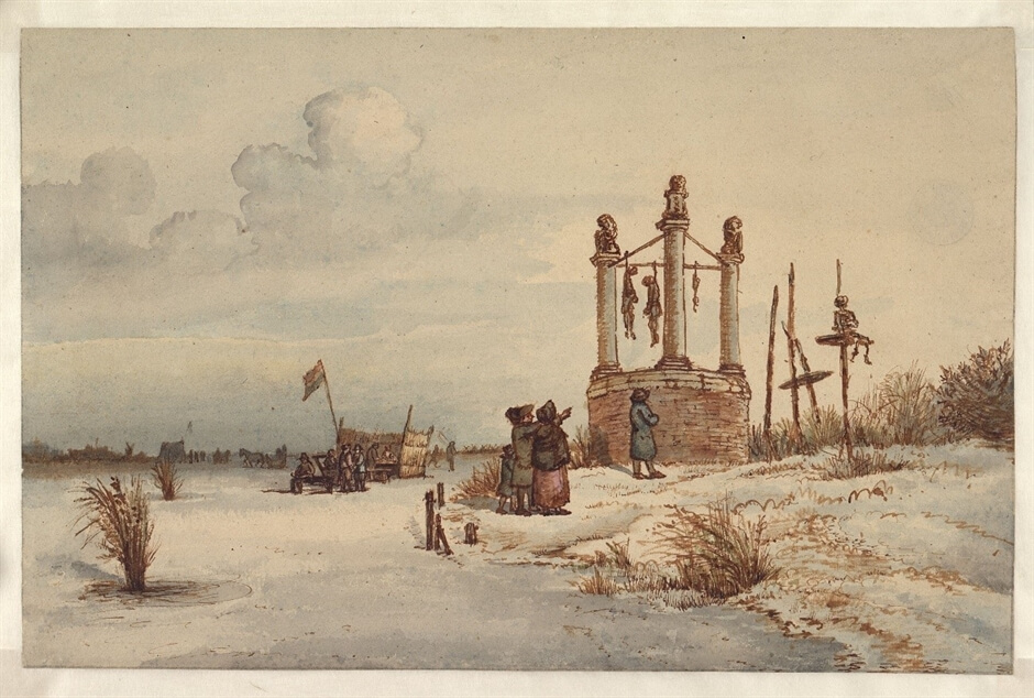 1820. Wintergezicht aan de Volewijck, met enkele toeschouwers bij de galgenput. Vanaf 1393 was dit eeuwenlang het belangrijkste stukje Amsterdam aan de overkant van het IJ. Tot 1795 was hier namelijk het galgenveld waar veroordeelden na de executie werden opgehangen, als afschrikwekkend voorbeeld.