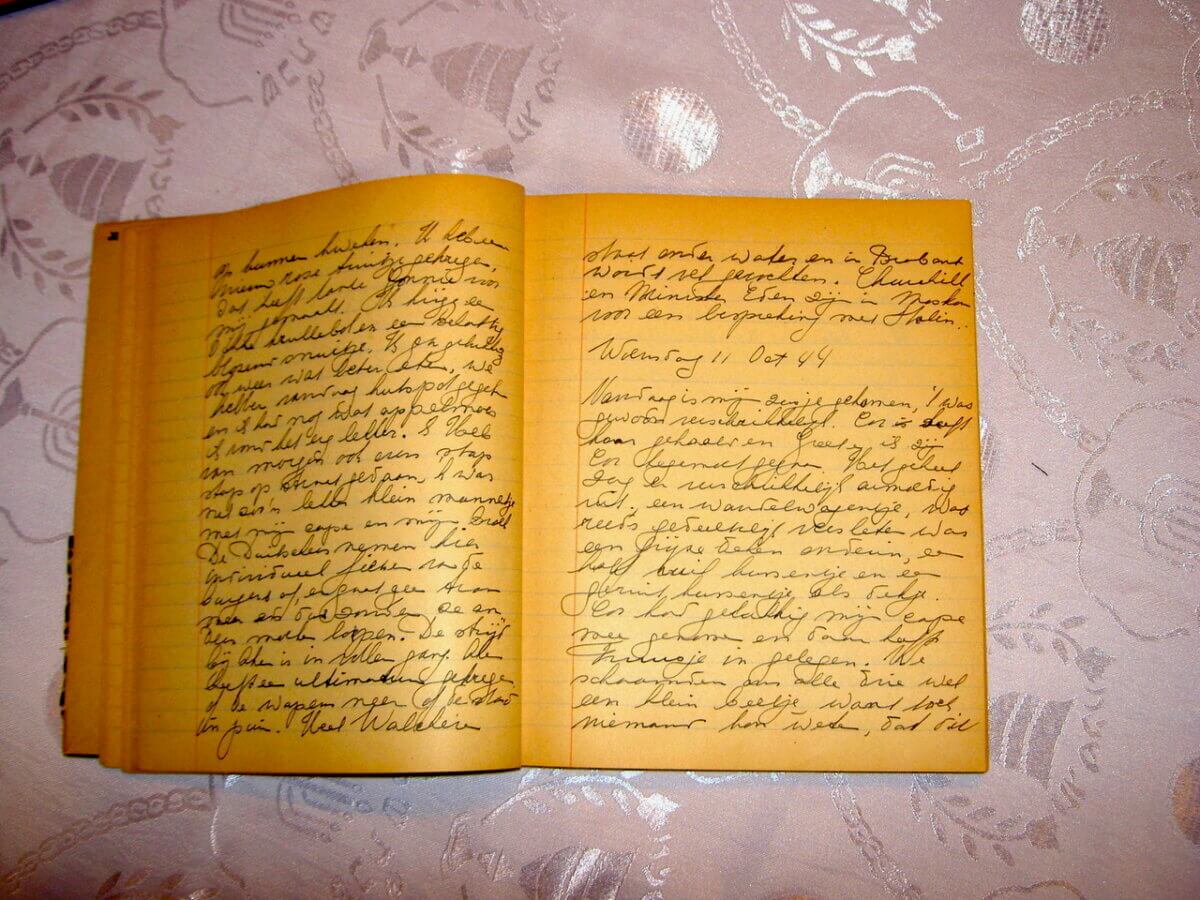 Ik lig in mijn bedje, we zijn zo verheugd geweest vanmorgen. Om negen uur begon het. Grote formaties vliegtuigen bij drie en vijf en acht en elf vlogen heel laag over en lieten op Schiphol grote pakketten levensmiddelen vallen. Dat konden we natuurlijk niet zien, maar we hadden hier vanaf de Memlingstraat een prachtig gezicht. Kokkie [dat is ‘Cor’] had mij in de vensterbank gezet. Kokkie en Greet huilden en ik schreeuwde, ja vijf of acht al naar me in mijn gedachten kwam. Kokkie riep: God bless you Tommies. En bij iedere formatie vliegtuigen riep ik” God bess you Tommies”. Is het bom, bom vroeg ik dan weer. Nee zei Greet, het is happies. Dan schreeuwde ik weer: “God, bess you Tommies, happies”. De kinderen liepen over de daken met witte handdoeken en er liep er zelfs één met een rood wit blauwe vlag. Dat is erg gevaarlijk, want als de Duitsers het zien schieten ze er op. Toen kwam er een formatie die heel laag over ons huis vloog. Kokkie gooide het raam los en zwaaide met een vodje. Greet zwaaide met het gordijn en ik gilde. De mensen op straat zwaaiden met hun zakdoeken, sommigen liepen hard met de vliegtuigen mee. Het was een spektakel op straat en er was geen Duitser te zien. Kokkie zette mij in mijn stoeltje voor het raam, want het eten moest klaargemaakt worden. Ja, daar kwamen er weer en dan gilde ik van: “ja, zijn ze”. Dan kwamen Cor en Greet weer kijken en zeiden, warempel, dat kleine ding. Om één uur vlogen de laatsten over. Toen kwamen Ruth en Eefje, twee half Jodinnetjes en vertelden dat er aanplakbiljetten waren, waarop stond dat Hitler dood was en Dönitz benoemd. Wellicht komen er nu gauw onderhandelingen en zijn we voor zondag vrij. Het wordt ook tijd want wij zijn ook finaal door onze voorraad heen.
