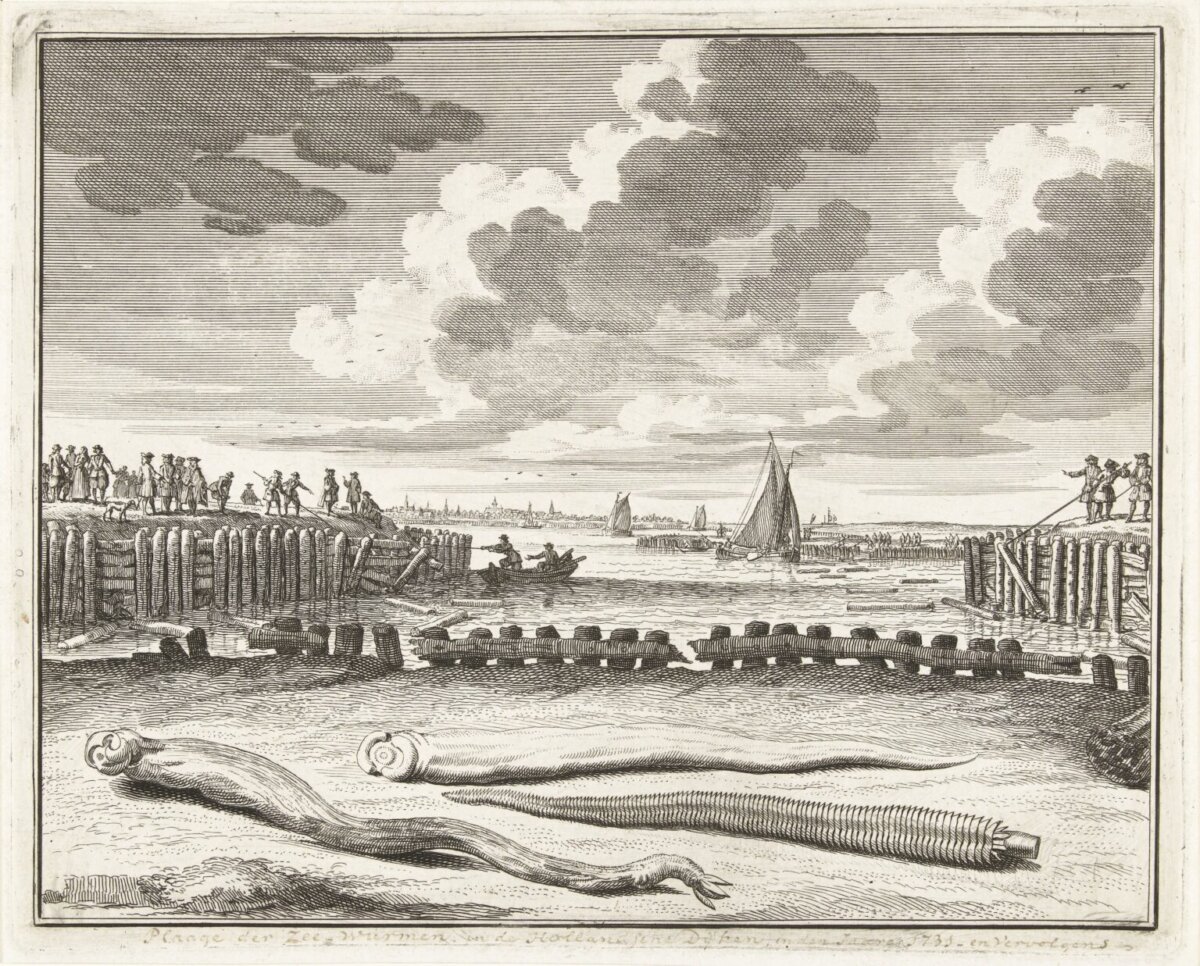 Net als de kakkerlak kwam ook de paalworm op VOC-schepen mee naar Nederland. Deze boormossel uit Azië vond in het hout van scheepsrompen en dijken een ideale leefomgeving. In 1730 sloeg de paniek toe, toen berichten uit West-Friesland meldden dat de houten constructies van de zeedijken massaal werden aangetast. Predikanten zagen er zelfs een straf van God in, terwijl pamfletten uit het buitenland het einde van de stad Amsterdam voorspelden. En dat was niet geheel ondenkbaar, want verzwakte dijken betekenden levensgevaar. Er gingen zelfs geruchten rond dat de paalworm in de houten stutten van het Amsterdamse stadhuis zaten – complete onzin natuurlijk.