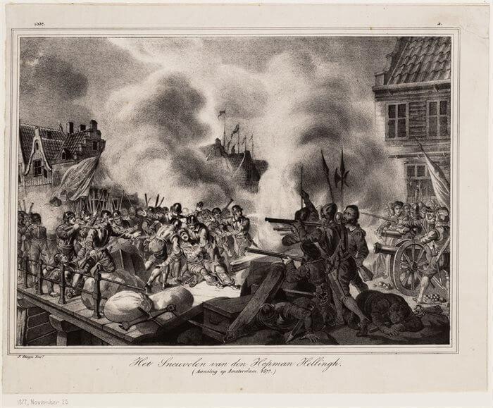 Hellings rechterhand komt met een klein groepje mannen een dag eerder aan in Amsterdam, op 22 november. Ze geven hun wapens af bij de Haarlemmerpoort en verspreiden zich door de straten. Ze zwieren langs herbergen en dranklokalen, en dansen de nacht weg met lokale meisjes aan hun arm en bierpullen in de hand. Luidruchtig en dronken melden ze zich de volgende ochtend weer bij de Haarlemmerpoort om hun wapens op te halen. Net buiten de poort krijgen ze het aan de stok met elkaar. Het lijkt op een dronkemansruzie. Er wordt geduwd en getrokken, heen en weer geschreeuwd, en de poortwachters kijken licht geamuseerd toe. Wanneer het uit de hand dreigt te lopen, grijpen ze in. En dat is precies waar de geuzen op hebben gewacht.
