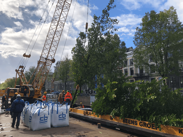Het verplaatsen van deze reuzen bleek nogal complex. Zo kun je ze alleen tussen oktober en april van de gracht halen. “Als bomen in het blad zitten, kun je niet aan de stam hijsen”, zegt boomtechnisch adviseur Jordy Jacobs, “dan kan stamschade ontstaan, waardoor de schors loslaat en de sapstroom onderbroken wordt. Dat betekent einde oefening voor de boom. Het luistert nogal nauw.” De Iepen die hier staan zijn maximaal dertig jaar oud. Niet te groot om te vervoeren en precies oud genoeg om een groot effect te hebben op het gebied van CO2-opslag en schaduwwerking. Kaljee: “Hoe eerder je een dikke boom hebt met grote kronen, hoe belangrijker hij is voor de stad.”