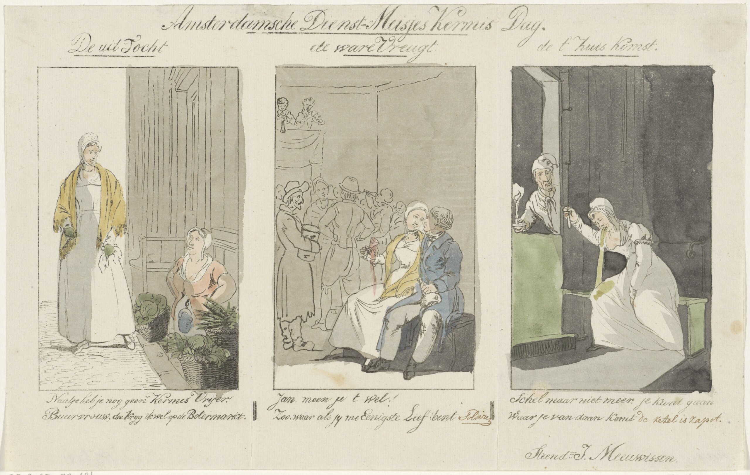Je kon ook het verkeerde dienstmeisje treffen. De Amsterdamse dienstmeisjes hadden sowieso niet altijd een beste reputatie, zoals op onderstaande prent uit 1828 te zien is: tekenaar J. Meeuwissen beeldde haar lanterfantend, vozend en stomdronken uit.