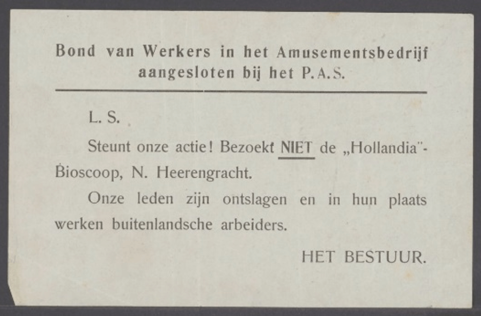 Vier werknemers van Scala, Apollo en Cinema Hollandia, waaronder Rosenau, worden door de directie beschuldigd van verspreiding van het pamflet en op staande voet ontslagen. De Bond ontkent elke betrokkenheid. Werknemers van Scala, Apollo en Cinema Hollandia leggen uit solidariteit het werk neer en worden eveneens weggestuurd. De ontslagen zijn voor de Bond reden om openlijk in het geweer te komen.