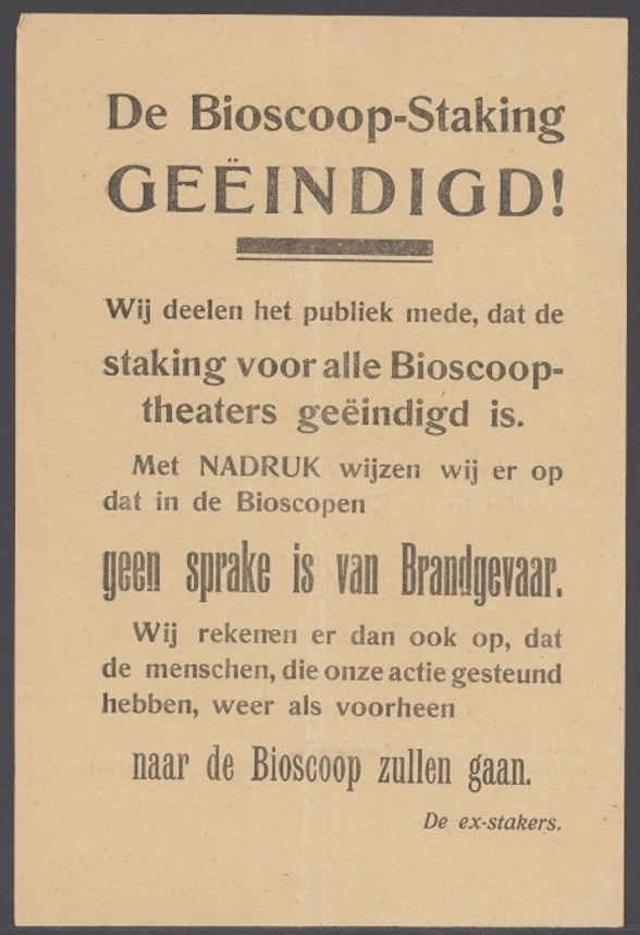 Twee weken later heeft de staking zich uitgebreid naar elf bioscopen. Ook nieuwe stakers worden ontslagen, waardoor het totaal op zesendertig komt. Inzet van de staking is ongedaan maken van het ontslag van alle stakers, want die zijn ‘veroordeeld tot den hongerdood.’
