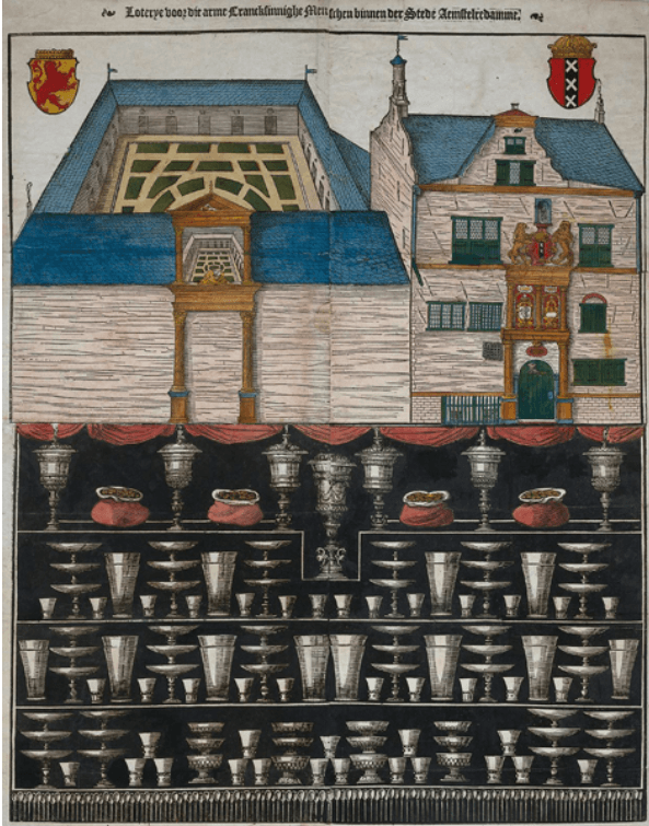 Het Dolhuys, een plek waar de geesteszieken werden behandeld, heeft ook kunnen profiteren van de loterijen. Gesticht in 1561 aan de Kloveniersburgwal, begon het Dolhuys al redelijk snel om uitbreiding te behoeven. Voor de bekostiging ervan werden tussen 1591 en 1592 loterijen gehouden. Eenmaal toestemming te hebben verkregen van het stadsbestuur, volgde de prent waarop de kopers de te winnen prijzen konden waarnemen. Verder heeft een kunstenaars een impressie gegeven van de te realiseren renovatie van het Dolhuys.