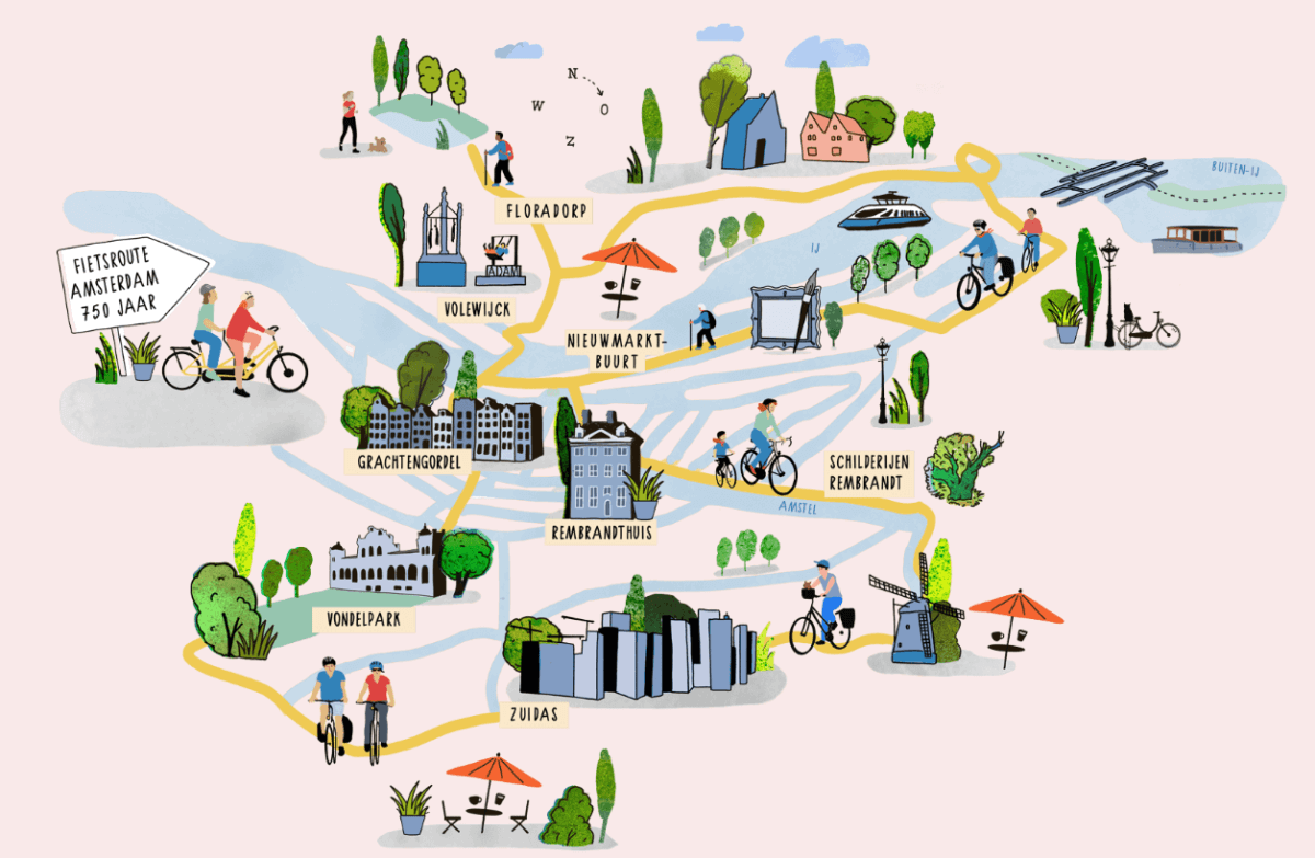 De fietsroute Amsterdam 750 jaar (38 km) voert vanaf de pont achter het Centraal Station via de tuindorpen in Noord naar de Nieuwmarktbuurt en via de Zuidas naar het stadscentrum met het Vondelpark en de grachtengordel.