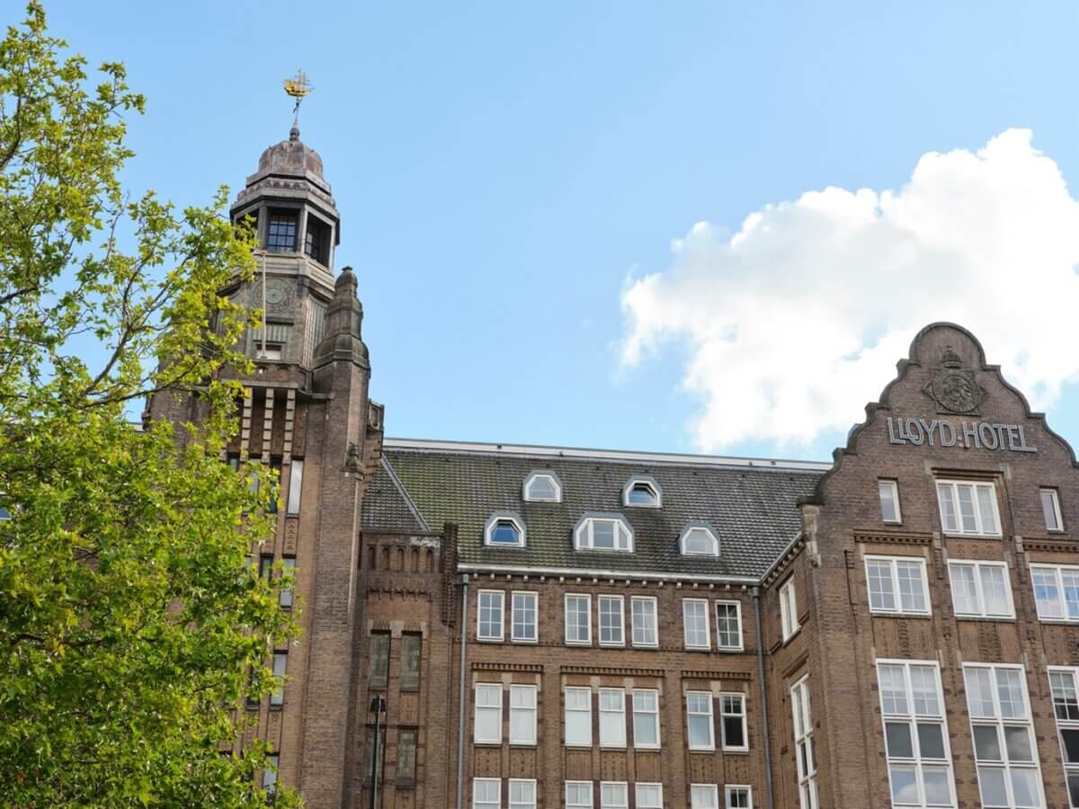 Gebouwd in 1921 door Royal Dutch Lloyd en ontworpen door Evert Breman begon dit iconische gebouw als hotel voor emigranten die koers zetten naar Zuid-Amerika. De gedurfde bakstenen architectuur combineert de charme van de Amsterdamse School met praktische elementen uit het begin van de twintigste eeuw. Maar het liep anders dan gepland: het oorspronkelijke scheepvaartbedrijf ging al na 15 jaar failliet. Vanaf dat moment veranderde de functie van het gebouw met de tijd mee. Het bood onderdak aan Joodse vluchtelingen, werd tijdens de Tweede Wereldoorlog een door nazi’s gerunde gevangenis in voorlopige hechtenis, en diende na de oorlog als detentiecentrum en later als jeugdinstelling. Indrukwekkende verhalen, indrukwekkende geschiedenis. De jaren ’90 brachten een nieuw hoofdstuk: kunstenaars trokken in het pand en het gonste opnieuw van creativiteit. In 2004 onderging het Lloyd een grootschalige renovatie door architectenbureau MVRDV, wat het gebouw transformeerde tot een cultureel trefpunt – een hotel met een twist, gevuld met kunst en een culturele agenda. In 2001 werd het Lloyd officieel erkend als rijksmonument – een levend icoon.