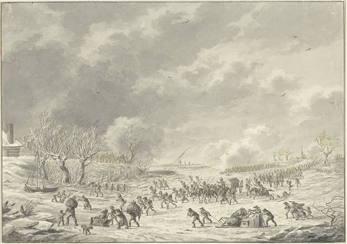 Tijdens de Eerste Coalitieoorlog werd het zuidelijke deel van de linie in 1794 en 1795 onder water gezet om Holland en Utrecht te beschermen tegen – wéér – de Fransen. Er kwamen verschillende versterkte punten op de linie, die goed bewapend waren met tussen de 6 en 10 kanonnen. Maar er was 1 probleem: de kanonnen moesten bemand worden door soldaten en daar waren er niet genoeg van. Om het nog erger te maken, begon het in december te vriezen. Binnen een week vroor een deel van de waterlinie dicht. De Franse soldaten hadden vervolgens geen kind meer aan de verdedigingslinie en trokken over bevroren rivieren naar Utrecht.