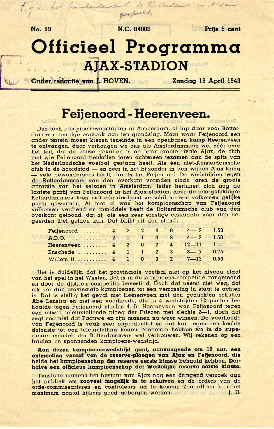 Ajax was in die oorlogsjaren solidair als een bevriende club in de problemen kwam. Zo werd Stadion De Meer in 1943 gratis beschikbaar gesteld aan Feyenoord voor een officiële thuiswedstrijd tegen Heerenveen. Het was een vriendschappelijk gebaar na een toeschouwersverbod in De Kuip, uit angst voor een bombardement. Deze sportieve solidariteit kreeg veel waardering van de voetbalwereld. Een jaar later werd Ajax zelf geholpen door Heerenveen, net als de stadsgenoten Blauw-Wit, DWS en De Volewijckers. De Friese club ving tijdens de Hongerwinter tientallen jeugdspelers op. Daar konden ze aansterken na de grote voedseltekorten in hun eigen stad. Zo toonde de sport in de moeilijkste tijden toch nog haar menselijkheid.