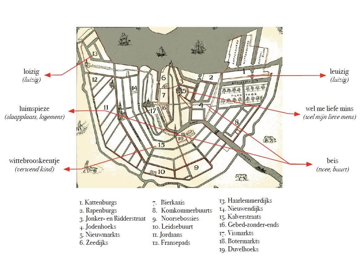 Het Jordanees was bourgondisch, het Haarlemmerdijks klonk Achterhoeks. In de Kalverstraat spraken ze ‘net’ Amsterdams, oftewel Kalverstraats, terwijl op de Vismarkt het Kalverstraats werd geschreeuwd (de viswijventongval). Van de Utrechtsestraat tot de Amstel was een plattere variant van het Kalverstraats de voertaal (Botermarkts) en in de Duvelshoek verstond zelfs de duivel het niet.