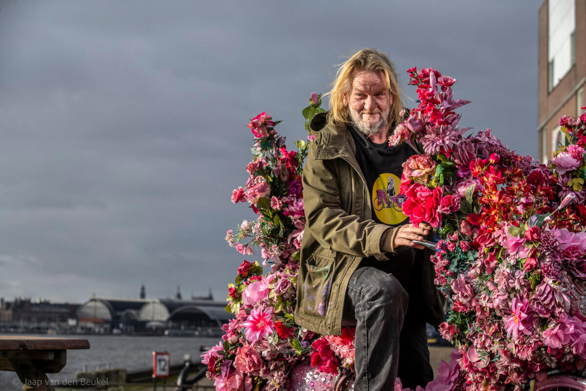 ‘Noord is vrijheid! Noord is anonimiteit – hoewel dat steeds minder voor mij geldt. Natuurlijk was het vroeger rauwer. Wist je dat Wondr een bordeel was? De bootmensen gingen er graag heen. Je betaalde entree en dan ‘ontmoette’ je gegarandeerd een vrouw aan de bar. Verderop zit De Pizzabakkers, ooit mijn allereerste opdrachtgever. Helaas is die bloemenfiets in de fik gestoken. Daarna hebben we een paal bij ze voor de deur met bloemen en gras versierd.’
