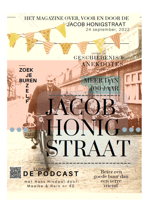 De Jacob Honigstraat. Onze straat. Mijn straat. In deze podcast, of dit straatverhaal, ga ik een heel klein stukje vertellen over de geschiedenis van de straat. Hans Hindaal. Uit de Jacob Honigstraat Wie kent hem niet? Staand op het stoepje, kijkend door de straat. Hij houdt alles in de gaten. En dat doet hij al jaren, want hij is één van de oudste buurtbewoners van de straat. Geboren en getogen.