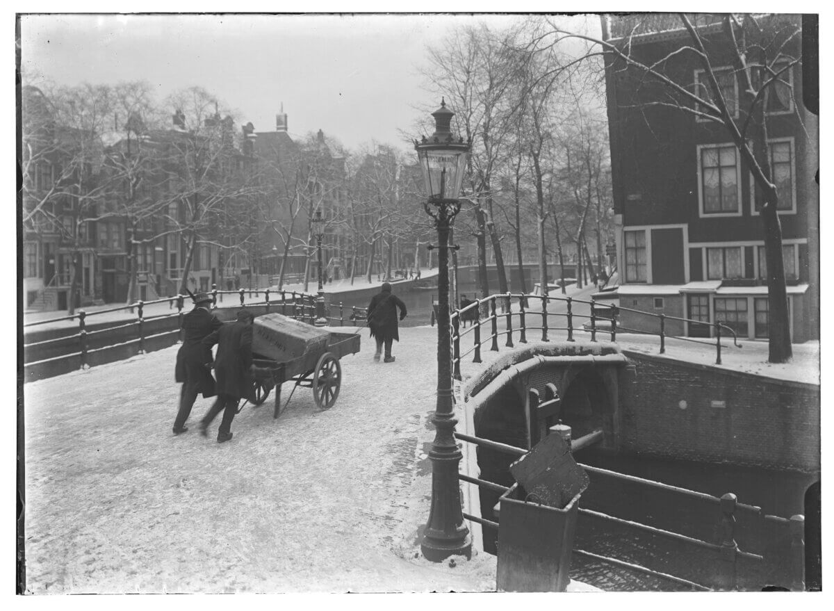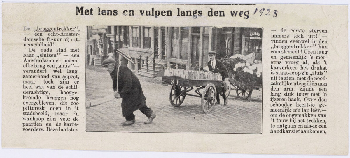 Belangrijk voor de bruggentrekkers was natuurlijk ook de handkar van de kooplui, zijn klant. De oude handkar, met twee wielen en handvatten om voort te stuwen, typeerde het Amsterdamse straatbeeld in de vroege twintigste eeuw. Ambachtslui, boeren en winkeliers trokken door de stad terwijl ze hun diensten of waren aanboden.