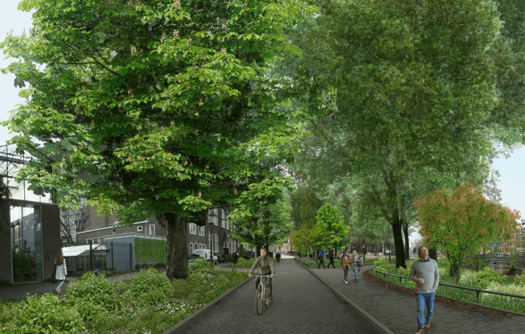 ‘We willen gaan waar de energie zit, en zoals gezegd was er hier heel veel energie, op alle niveaus, van bewoners tot ondernemers, van pandeigenaren tot VvE’s. Die activiteit en diversiteit maakt het gebied ook zo bijzonder. In 2018 startte daarom vanuit hier het project Knowledge Mile Park. De Gemeente Amsterdam en de biz Knowledge Mile werden trekkers. Het was best spannend, die beginperiode, want er was een ambitie, een idee, maar dat was het. Het project werd opgezet om samen met partners de initiatieven werkelijkheid te maken, samen te werken aan oplossingen en uitdagingen van onze hoofdstad, en de vergroening en verduurzaming van de stadsstraat te faciliteren.’
