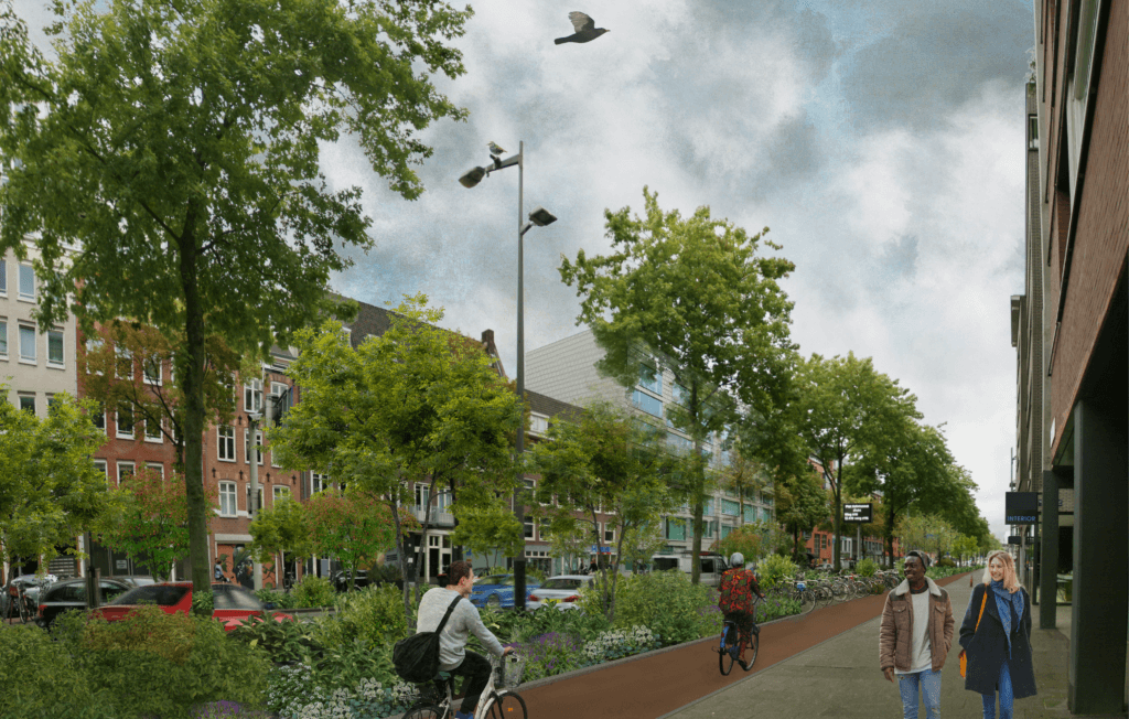 ‘Het begon rond 2015. Lange tijd was de straat een gevoelig punt, tot op een gegeven moment met een andere bril naar de situatie gekeken werd. Het idee is ontstaan vanuit onderop, vanuit de gebruikers van het gebied. Verschillende mensen uit de buurt, waaronder de bewoners en de Hogeschool van Amsterdam, wilden hun tijd en energie erin steken. Zij begonnen kansen te zien in plaats van de drukke verkeersader. In 2017 is de biz opgericht. Vanuit de biz werd verder gekeken hoe we konden reageren op de grootstedelijke uitdagingen, hoe we hierin konden samenwerken met de kennisinstellingen, en hoe we kunnen vergroenen. Er ontstond een droom hoe de straat eruit kon zien, wat het kon worden.’