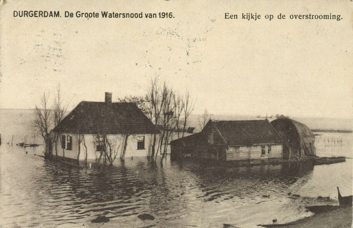 In de nacht van 13 op 14 januari 1916 voltrok zich een ramp rond de Zuiderzee. Als gevolg van stormvloed en een extreem hoge waterstand door aanhoudende regen brak de Waterlandse Zeedijk op diverse plekken door. Grote delen van Waterland kwamen blank te staan, tot aan Purmerend toe. Ook de aarden wallen van het Vuurtoreneiland waren niet opgewassen tegen het hoge water. De soldaten die de kustbatterij tijdens de Eerste Wereldoorlog bemanden, zochten een veilige plek op het dak van de kazerne terwijl het eiland onder water liep. Soldaten op andere stellingforten in het Noordfront schoten de bevolking te hulp met reddings- en herstelwerkzaamheden. Grote delen van de aarden wallen van het onvoltooide Fort bij Kwadijk werden bijvoorbeeld gebruikt om zandzakken te vullen, waarmee gaten in de dijk werden gedicht.