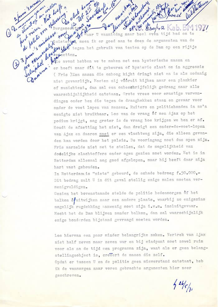 Burgemeester Samkalden wilde de huldiging op de Dam organiseren, maar na negatief advies van de politie vonden de festiviteiten plaats op het Leidseplein.