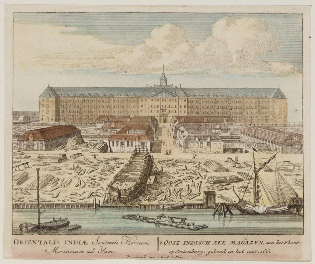 Het Oost-Indische Zeemagazijn op het eiland Oostenburg was een gigantisch pakhuis van de VOC. Het was het grootste gebouw van Amsterdam en had 2 vleugels van ieder 4 verdiepingen. Het enorme gebouw was 215 meter breed en 25 meter diep, en besloeg de volle breedte van de werf. In het pakhuis lagen voorraden voor de schepen en kostbare goederen opgeslagen. En er was een aparte verdieping voor de opslag van kaurischelpen. Zoveel waren er.