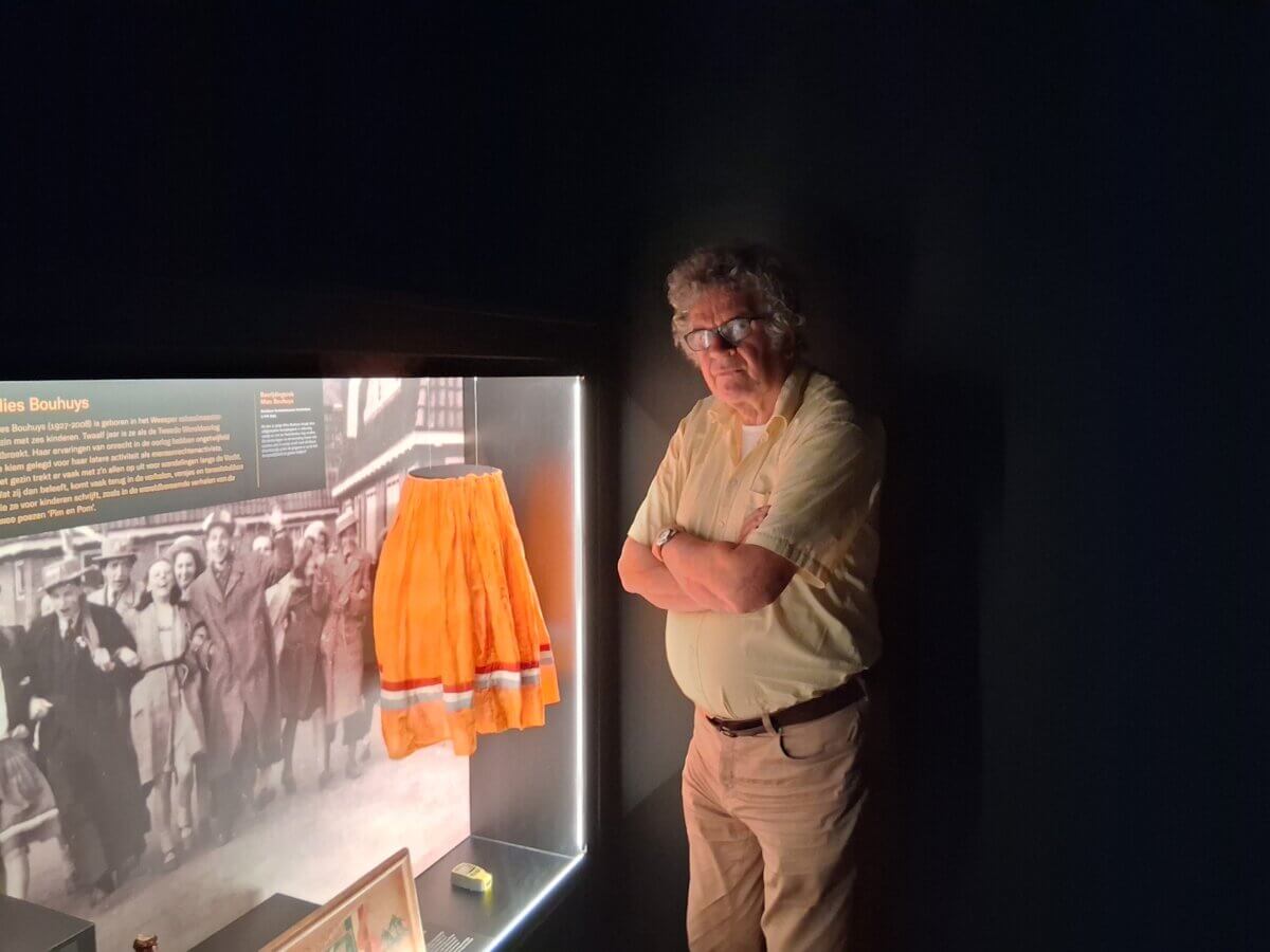 In Amsterdam is Sjoerd actief als vrijwilliger, namelijk als museumdocent in het Verzetsmuseum. Daar leerde hij plaatsgenoot Dennis Koek kennen, die daar werkzaam is in de technische dienst, en wiens collectie ‘Bevrijdingsmemorablia’ momenteel tentoongesteld wordt in Museum Weesp. Een wel heel bijzonder item uit de collectie van het Verzetsmuseum heeft een centrale plek gekregen in deze tentoonstelling getiteld ’80 jaar Vrijheid’: de feest- of bevrijdingsrok van Mies Bouhuys. Hij hangt nu in volle glorie in een van de museumvitrines. Naast de foto uit 1945 waarop Mies hem draagt, vrolijk dansend op het Weesper singel, met een uitgelaten, bevrijde, menigte.