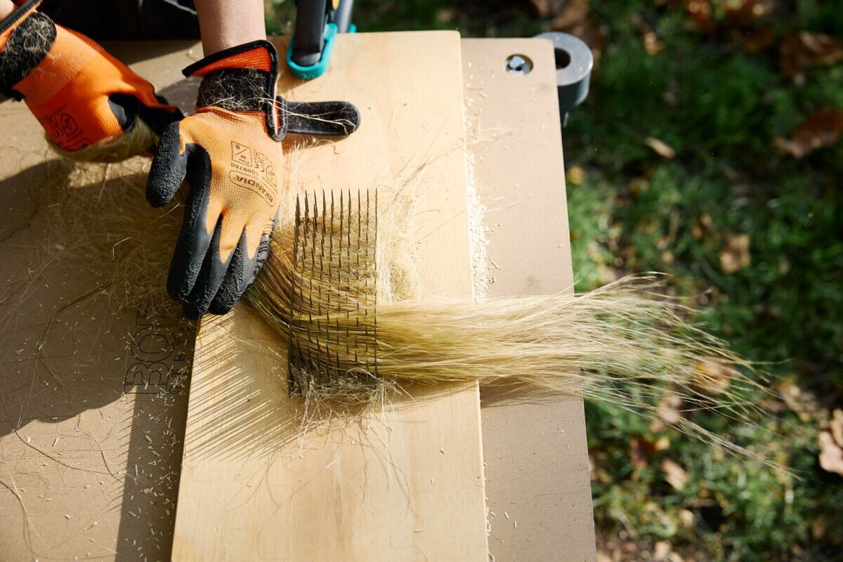 Vlas verwerken is een complex proces dat eeuwenlang de basis vormde van de Nederlandse textielindustrie. Op een perceel van 25m² op het Marineterrein is het vlas gezaaid, gekweekt en geoogst. Daarna is het getrokken met de hand. In vergelijking met machinale werkwijzen, zorgt deze traditionele methode voor langere vezels van betere kwaliteit. Na het roten—blootstelling aan vocht om de pectine af te breken die de vezels aan elkaar bindt—is het vlas te drogen gelegd in de Commandantswoning op het Marineterrein. Een proces van braken, zwingelen en hekelen transformeerde de ruwe vlasplant vervolgens tot werkbare vezels door het te scheiden van de houtachtige bestandsdelen. Elke stap binnen de vlasbewerking bepaalt de uiteindelijke kwaliteit van de vezels. Tot slot is het vlas op lengte gesorteerd en in vlaspoppen gedraaid: klaar om te spinnen.