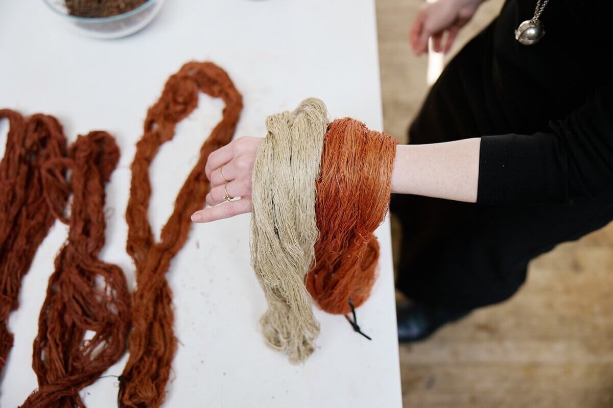 Voor de rode kleur zijn de wortels van drie jaar oude meekrap gebruikt, geoogst op het Marineterrein. Meekrap bevat tientallen verschillende chromatische componenten, die afhankelijk van het verfproces in verschillende samenstellingen naar voren kunnen komen. Deze rijkdom aan kleurtonen geeft het garen een unieke diepte en levendigheid, die onmogelijk te repliceren is met industriële kleurstoffen. Naast meekrap is ook coreopsis (‘meisjesogen’) gebruikt om een warmer kleurpalet te creëren.