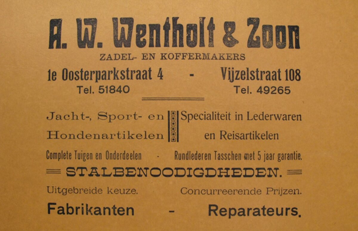 Mijn over-overgrootvader, Arnoldus Wilhelmus Wentholt (1850–1933), leerde het vak van zadelmaker in Arnhem. In 1870 vestigde hij naar Amsterdam, waar de bedrijvigheid en de groei van de stad nieuwe kansen boden. Acht jaar later, in 1878, begon hij zijn eigen winkel aan de 1e Oosterparkstraat 24. Het was de start van een familiegeschiedenis die tot op de dag van vandaag voortduurt.