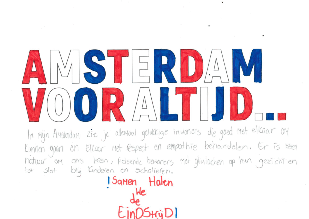 “In mijn Amsterdam zie je allemaal gelukkige inwoners die goed met elkaar om kunnen gaan en elkaar met respect en empathie behandelen. Er is veel natuur om ons heen, fietsende bewoners met een glimlach op hun gezicht en tot slot bij kinderen en scholieren. Samen halen we de eindstrijd!