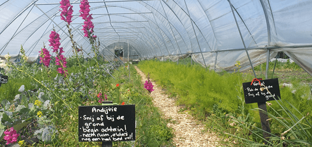 “Moet je eens voelen”, zegt Iris Poels, als ze met zichtbaar plezier een hand aarde pakt. “Dit is nou kleigrond. Weet je waarom het zo vruchtbaar is? Klei houdt vocht beter vast. En dat maakt de Lutkemeerpolder zo speciaal: hier ligt de laatste vruchtbare zeekleigrond van Amsterdam. De schoonste grond ook!” Poels wijst op een krop sla in een sappig tuinbed: “Zelfs met deze droogte hebben we hier geen sproeiers nodig”, glundert ze.