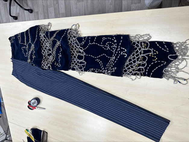 Momenteel is Yasmien bezig met het upcyclen van mooie ouderwetse items van de kermis. Ze komt uit een kermisgeslacht en is opgegroeid tussen de draaimolen en de rups. “Ik ben teruggegaan naar mijn roots en ben in de oude materialen gedoken. Denk bijvoorbeeld aan de honderd jaar oude ‘rabatten’; dat zijn de decoratieve fluwelen doeken die in de carrousel hingen. Er staan prachtige wapentekens op met handgeborduurde glaskralen. Die heb ik omgetoverd in een pak.”