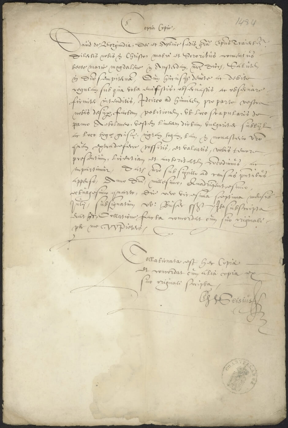 In deze oorkonde uit 1484 geeft David van Bourgondië, de bisschop van Utrecht, de nonnen van het Sint Maria Magdalenaklooster op het Spui toestemming om in plaats van een wollen scapulier (schouderkleed) dat ze hiervoor droegen, nu een linnen gewaad te dragen en in plaats van een grijze toga een zwarte.