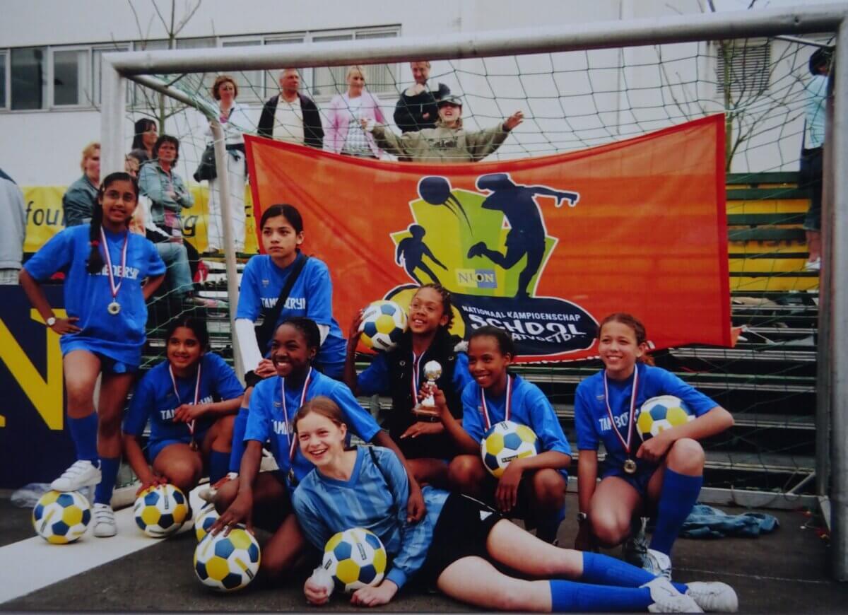 Meedoen aan het schoolvoetbaltoernooi in 2007? Ja, natuurlijk! Geen van de meiden uit groep 8 van OBS De Tamboerijn zat op voetbal. Maar hun meester Santhosi zag hun energie, hun samenspel en hun plezier. Dus schreef hij ze in.