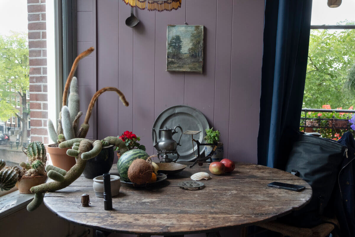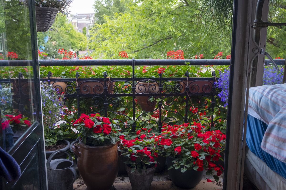 Een groot balkon vol rode bloemen fleurt de kale gevel van het hoekpand aan de gracht op. Het is het enige ‘buiten’ dat Bendert Dijkstra (78) heeft bij zijn appartement van 28 vierkante meter op de tweede verdieping, waar hij al sinds de jaren tachtig woont. Zo komt hij toch wat aan tuinieren toe: ook de potten bij het kleine keukenraam en die bij de voordeur aan krijgen elke dag zorg en aandacht. “Ik ben gek op plantjes”, zegt Bendert. “Dat komt omdat ik als kind al in de moestuin van mijn ouders werkte, aan de rand van de heide in Ermelo. We verbouwden er van alles.” Bendert woont al vanaf zijn zes- of zeventiende in Amsterdam, op verschillende plekken. Ook zijn beroep wisselde: “Ik ben van alles geweest, van bankbediende tot klusjesman. En ik heb veel maatschappelijk werk gedaan, waaronder tien jaar ouderenzorg.”