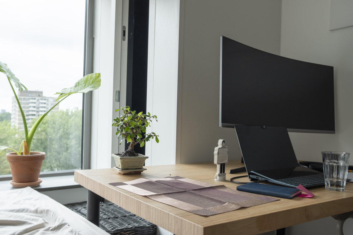 Friesland is ver weg in het zeventien etages tellende studiocomplex in Nieuw-West waar hij woont, pal naast een moskee inclusief minaret. Hier treft hij het internationale karakter van de stad in het klein. De toegang tot het complex leidt via een binnenplein naar een Engelssprekende conciërge. Op de twaalfde verdieping volgt een lange gang met rijen groene deuren, waarvan er één huisnummer 750 heeft. Achter de voordeur een bescheiden studio met uitzicht op de A10 en het Rembrandtpark. Eindelijk een eigen plek om langere tijd én zonder huisgenoten te kunnen wonen. Het mag ook wel eens, nadat hij jarenlang om de zoveel tijd verplicht moest verhuizen dankzij tijdelijke huurcontracten. “Na mijn studententijd ben ik zeven keer verhuisd. Ik heb in bijna elk stadsdeel gewoond, tot aan het Spui aan toe. Via een vriendin die bij eenzelfde complex in Zuidoost woonde kwam ik hier terecht. Ik woon er nu vijf jaar. Best fijn om niet weer na een jaar te moeten verhuizen.”