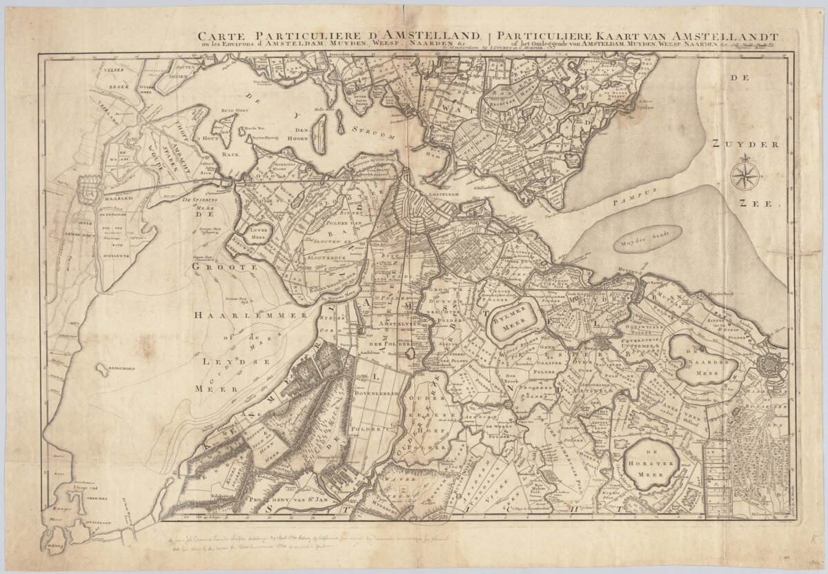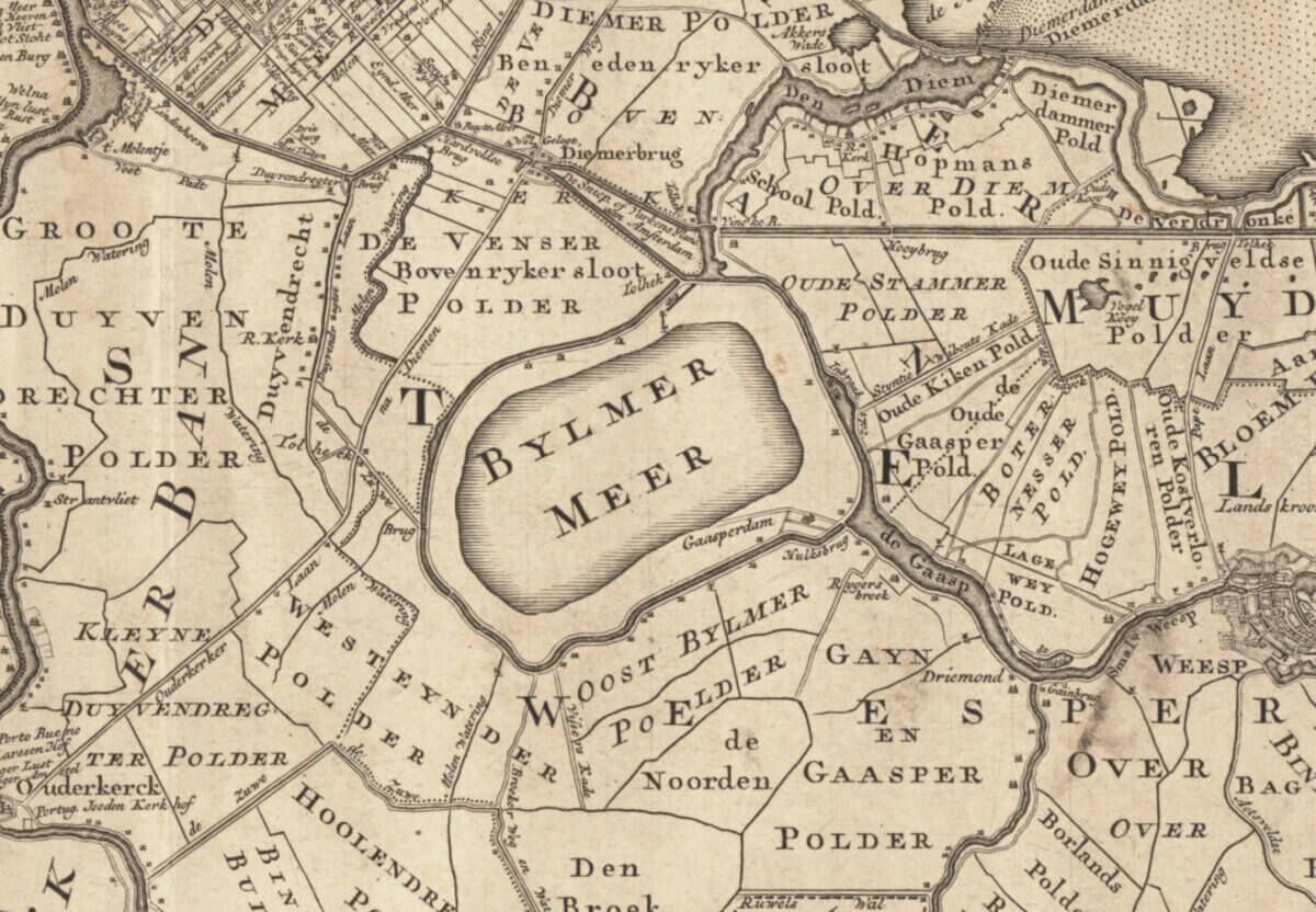 Hoewel er in de 17e eeuw al veel land in en rond Amsterdam was drooggelegd, is op de kaart Amstelland, uitgegeven rond 1740 door Covens en Mortier, nog flink wat water zichtbaar. Opvallend is het gigantische De Groote Haarlemmermeer, maar er is meer. Kijk bijvoorbeeld rechtsmidden op de kaart, naar het ‘Bylmermeer’.